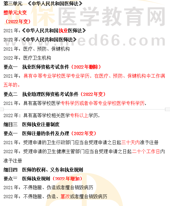 2022年中醫(yī)執(zhí)業(yè)醫(yī)師資格考試大綱已經(jīng)公布,下載電子版請點(diǎn)擊( 2022年國家中醫(yī)執(zhí)業(yè)醫(yī)師資格考試大綱(實(shí)踐技能+綜合筆試)完整版下載 )。醫(yī)學(xué)教育網(wǎng)老師整理了“2022年中醫(yī)執(zhí)業(yè)醫(yī)師衛(wèi)生法規(guī)》官方教材變動對比”,詳情如下: