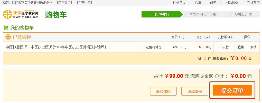 第一步:點(diǎn)擊“購(gòu)課”按鈕,加入我的購(gòu)物車;