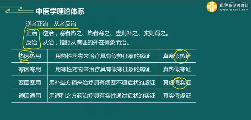 (2)反治:指順從病證的外在假象而治的一種治療原則。適用于疾病的征象與其本質(zhì)不相符的病證,即病有假象者。又稱(chēng)為“從治”。包括:①熱因熱用,即以熱治熱,是用熱性藥物來(lái)治療具有假熱征象的病證。適用于陰盛格陽(yáng)的真寒假熱證。②寒因寒用,即以寒治寒,是用寒性藥物來(lái)治療具有假寒征象的病證。適用于陽(yáng)盛格陰的真熱假寒證。③塞因塞用,即以補(bǔ)開(kāi)塞,是用補(bǔ)益藥物來(lái)治療具有閉塞不通癥狀的虛證。適用于“至虛有盛候”的真虛假實(shí)證。④通因通用,即以通治通,是用通利的藥物來(lái)治療具有通瀉癥狀的實(shí)證。適用于“大實(shí)有羸狀”的真實(shí)假虛證。
