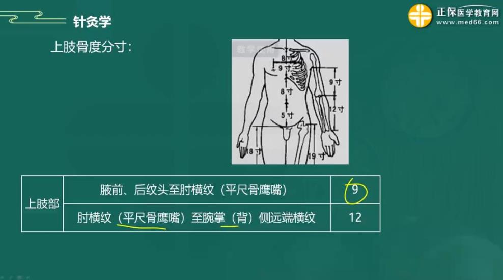 (1)腋前、后紋頭至肘橫紋(平尺骨鷹嘴)——9直寸;