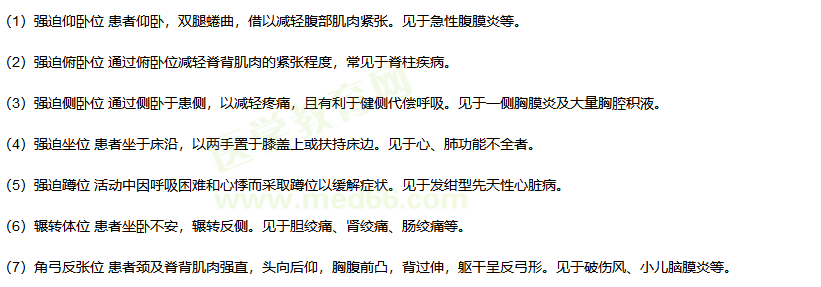 強迫體位 患者為減輕疾病所致的痛苦,被迫采取的某些特殊體位。常見的體位有以下幾種: