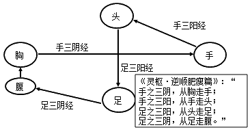 十二經(jīng)脈在四肢的分布規(guī)律:手足陽(yáng)經(jīng)為陽(yáng)明在前、少陽(yáng)在中、太陽(yáng)在后;手足陰經(jīng)為太陰在前、厥陰在中、少陰在后。
