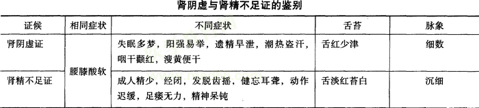 兩者皆屬腎的虛證,均可見腰膝酸軟、頭暈耳鳴、齒松發(fā)脫等癥,但前者有陰虛內(nèi)熱的表現(xiàn),性欲偏亢,夢遺、經(jīng)少;后者主要為生長發(fā)育遲緩,早衰,生育機能低下,無虛熱表。