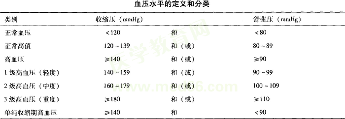 (1)高血壓 未服抗高血壓藥的情況下,收縮壓≥140mmHg(或)舒張壓≥90mmHg,即為高血壓。如果只有收縮壓達到高血壓標準,則稱為單純收縮期高血壓。高血壓絕大多數(shù)見于高血壓?。ㄒ喾Q原發(fā)性高血壓);繼發(fā)性高血壓少見(約<5%),見于腎臟疾病、腎上腺皮質(zhì)或髓質(zhì)腫瘤、肢端肥大癥、甲狀腺功能亢進癥、妊娠高血壓綜合征等所致的血壓增高。