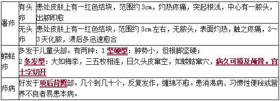 2.特點:腫勢限局,范圍多在3cm左右,突起根淺,色紅、灼熱、疼痛,易膿、易潰、易斂。