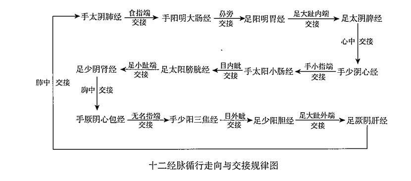 十二經(jīng)脈的循行交接規(guī)律是:①相表里的陰經(jīng)與陽(yáng)經(jīng)在手足末端交接,如手太陰肺經(jīng)在食指端與手陽(yáng)明大腸經(jīng)相交接;手少陰心經(jīng)在小指端與手太陽(yáng)小腸經(jīng)相交接;手厥陰心包經(jīng)在無(wú)名指端與手少陽(yáng)三焦經(jīng)相交接;足陽(yáng)明胃經(jīng)在大趾內(nèi)端與足太陰脾經(jīng)相交接;足太陽(yáng)膀胱經(jīng)在小趾端與足少陰腎經(jīng)相交接;足少陽(yáng)膽經(jīng)在大趾外端與足厥陰肝經(jīng)相交接。②同名的陽(yáng)經(jīng)與陽(yáng)經(jīng)在頭面部交接,如手足陽(yáng)明經(jīng)交接于鼻旁,手足太陽(yáng)經(jīng)交接于目?jī)?nèi)眥,手足少陽(yáng)經(jīng)交接于目外眥。③相互銜接的陰經(jīng)與陰經(jīng)在胸中交接,如足太陰經(jīng)與手少陰經(jīng)交接于心中,足少陰經(jīng)與手厥陰經(jīng)交接于胸中,足厥陰經(jīng)與手太陰經(jīng)交接于肺中。十二經(jīng)脈循環(huán)走向與交接規(guī)律見(jiàn)下圖。