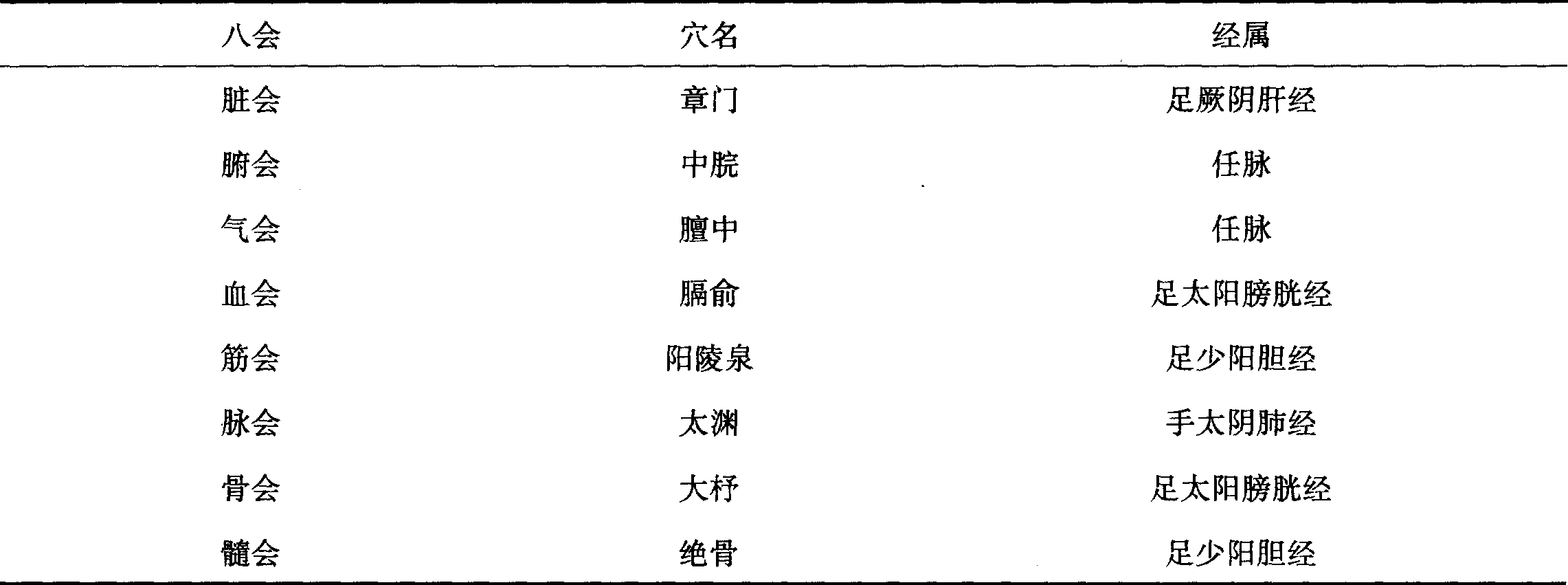 八會穴,是指臟、腑、氣、血、筋、脈、骨、髓等精氣所會聚的腧穴?!皶?,是聚會的意思。