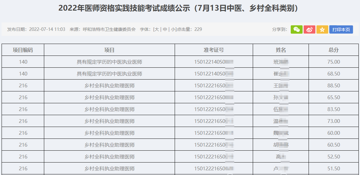 呼和浩特考點2022年中醫(yī)執(zhí)業(yè)醫(yī)師實踐技能考試成績公示(7月13日)
