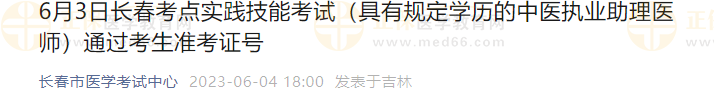 吉林長春官方公布2023年6月3日實踐技能考試(具有規(guī)定學(xué)歷的中醫(yī)執(zhí)業(yè)/助理醫(yī)師)通過考生名單,請相關(guān)考生及時查看,如有任何疑問及時與官方聯(lián)系,醫(yī)學(xué)教育網(wǎng)整理具體內(nèi)容如下: