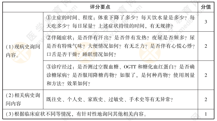2022年中醫(yī)實(shí)踐技能考試【病史采集】練習(xí)題03:男,58歲,退休。消瘦1年,伴多食、多飲、多尿、乏力