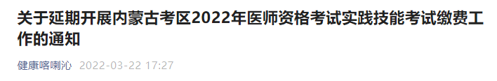因受新冠肺炎疫情影響,原定于2022年3月25日-31日開展的內(nèi)蒙古考區(qū)2022年醫(yī)師資格考試實(shí)踐技能考試階段的繳費(fèi)工作延期進(jìn)行,具體繳費(fèi)時(shí)間另行通知。