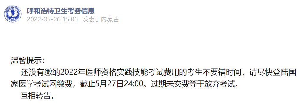 內(nèi)蒙古呼和浩特考點2022年中醫(yī)執(zhí)業(yè)醫(yī)師考試實踐技能繳費即將截止重要提醒