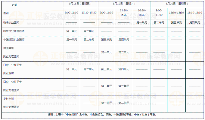 蒙醫(yī)、藏醫(yī)、維醫(yī)、哈薩克醫(yī)實行紙筆考試。其他類別實行計算機(jī)化考試。軍隊現(xiàn)役人員加試軍事醫(yī)學(xué),院前急救崗位和兒科專業(yè)加試相應(yīng)內(nèi)容。除蒙醫(yī)、藏醫(yī)、維醫(yī)、傣醫(yī)、哈薩克醫(yī)、中醫(yī)(朝醫(yī))專業(yè)、中醫(yī)(壯醫(yī))專業(yè)外,執(zhí)業(yè)醫(yī)師合格分?jǐn)?shù)線為360分,執(zhí)業(yè)助理醫(yī)師合格分?jǐn)?shù)線為180分??荚嚂r間如下: