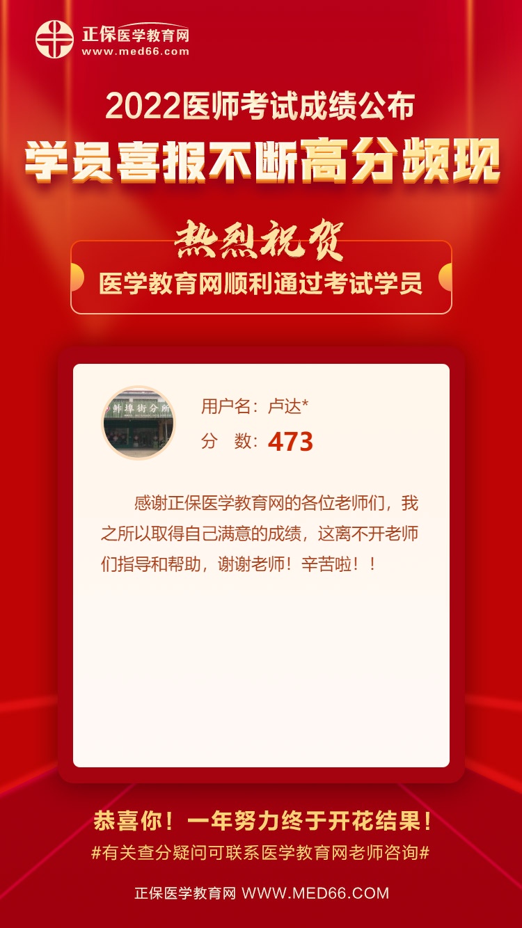 2022年醫(yī)師資格考試成績公布后,醫(yī)學(xué)教育網(wǎng)學(xué)員喜報(bào)不斷,高分頻現(xiàn)!在此醫(yī)學(xué)教育網(wǎng)小編熱烈祝賀各位順利通過考試的同學(xué)!同時(shí)也將大家成功的喜悅、備考心得一起分享給2023年考生。一起來看看吧!