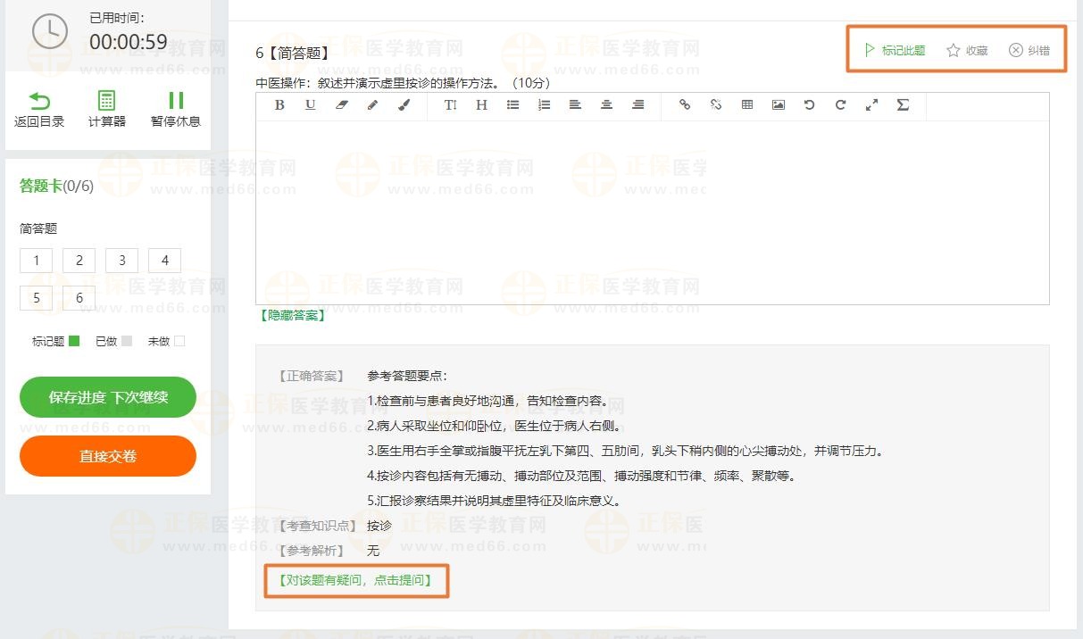 圍繞著做題,有不少實(shí)用的小功能,助你熟練掌握考點(diǎn)知識,高效備考,要用起來喲!各位考生可隨時對重難點(diǎn)題目進(jìn)行“收藏”、“標(biāo)記此題”或“糾錯”。如有疑問,你還可以針對試題進(jìn)行提問,醫(yī)學(xué)教育網(wǎng)老師會幫你解惑。