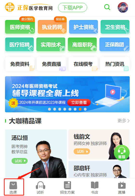 第一步:進入醫(yī)學教育網(wǎng)首頁(m.med66.com),點擊“選課”。