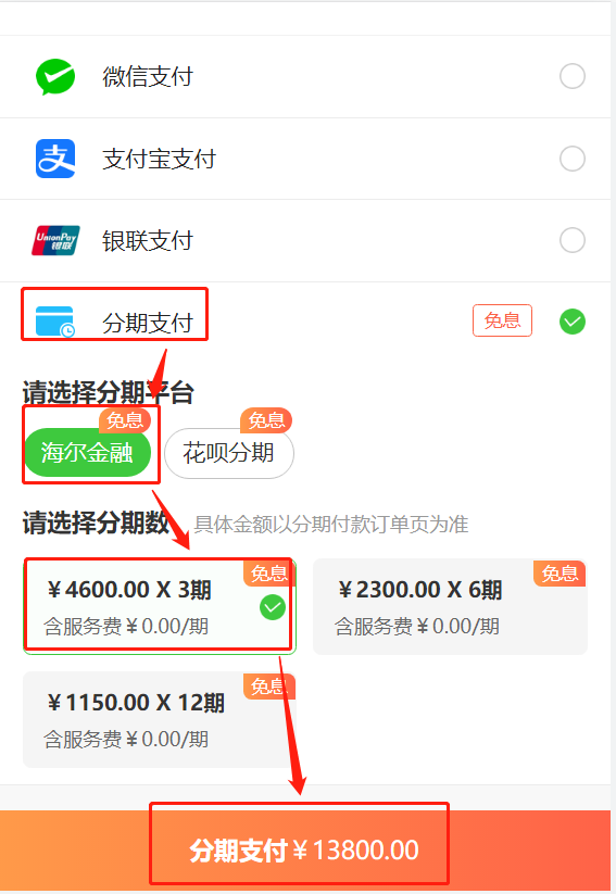 第四步:點擊“分期付款”,選擇分期類型及期數(shù)后,點擊“分期支付”。