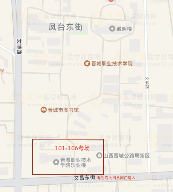 今年我市共設(shè)置晉城職業(yè)技術(shù)學(xué)院與晉城市財政局兩個考點,其中101-106考場在晉城職業(yè)技術(shù)學(xué)院樂業(yè)樓九樓,考生需從位于文昌東街的晉城職業(yè)技術(shù)學(xué)院南門進(jìn)入,如下圖所示: