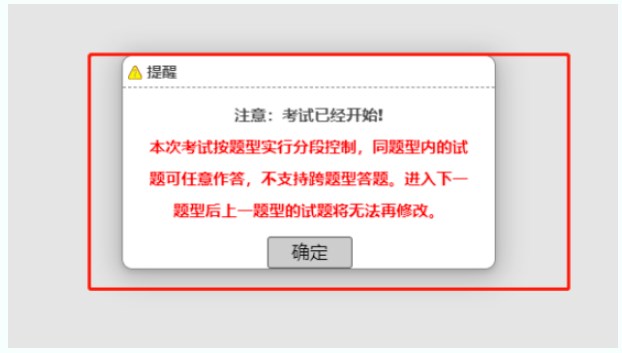 2、考試過程中,在當(dāng)前題型還存在未完成作答的題目時(shí),考生操作試題分段切換時(shí),系統(tǒng)會(huì)提醒: