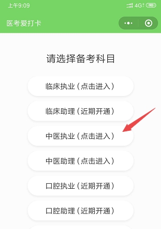 第二步:掃描之后會(huì)進(jìn)入如下截圖頁(yè)面,選擇您的備考科目,如中醫(yī)執(zhí)業(yè)(其他專業(yè)會(huì)陸續(xù)開(kāi)放);