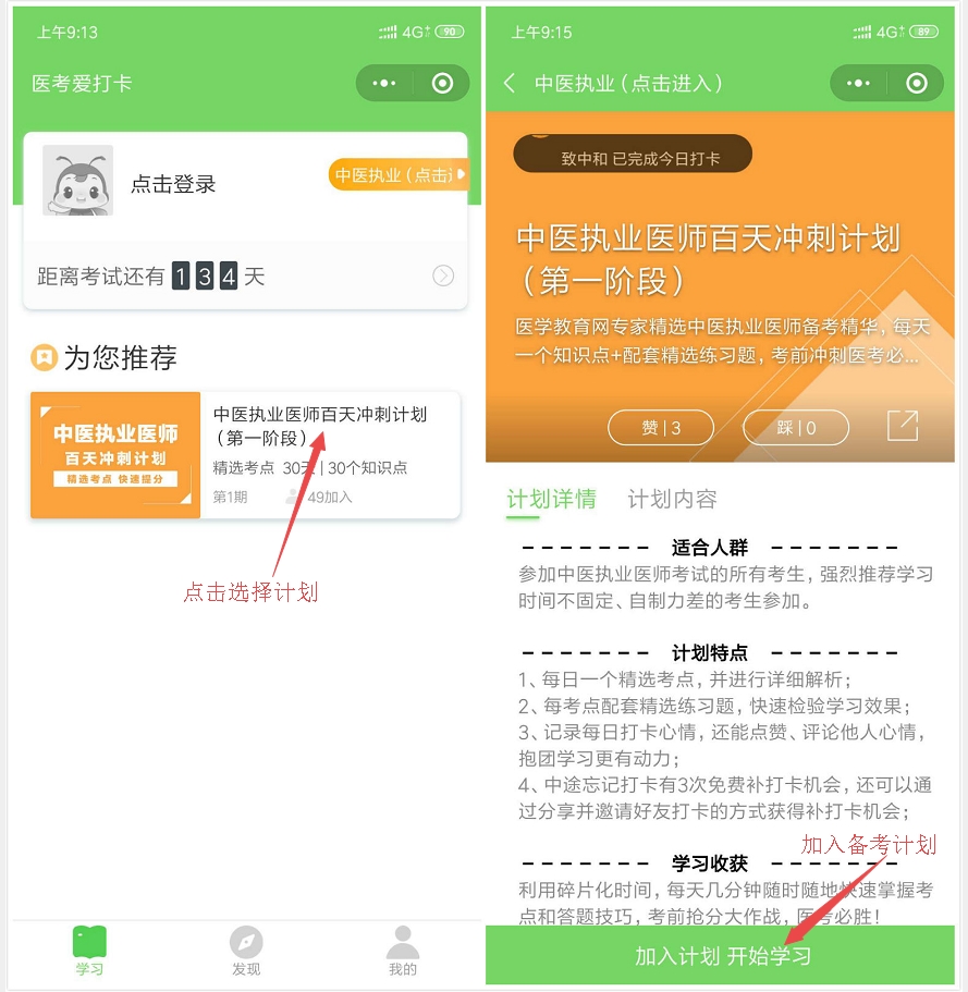 第三步:選擇備考科目后即進(jìn)入學(xué)習(xí)計(jì)劃選擇的頁(yè)面,請(qǐng)選擇“您的備考計(jì)劃”,如中醫(yī)執(zhí)業(yè)醫(yī)師百天沖刺計(jì)劃(第一階段),然后點(diǎn)擊下方“加入計(jì)劃 開(kāi)始學(xué)習(xí)”按鈕,開(kāi)始正式進(jìn)入打卡學(xué)習(xí)。
