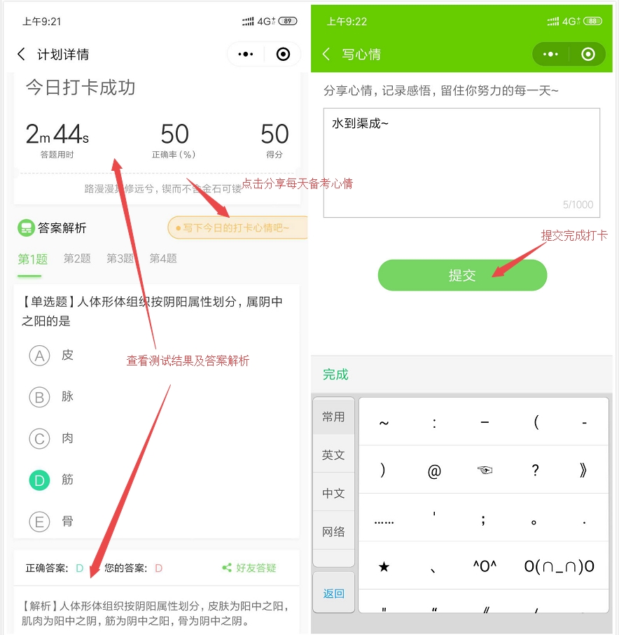 (3)查看測(cè)試結(jié)果+答案解析+分享今日打卡心情,提交完成打卡