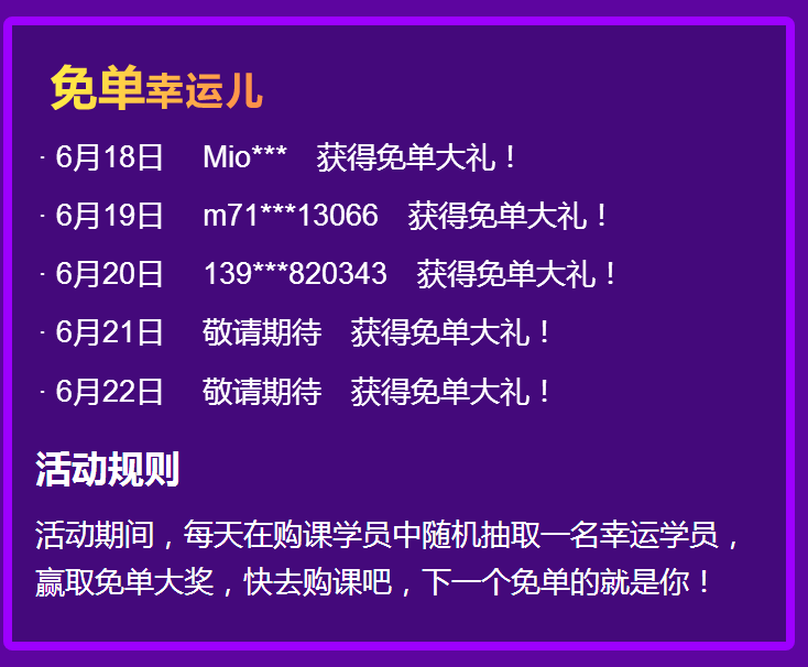 6月15日-6月23日期間 每天在購課學(xué)員中隨機抽取一名幸運學(xué)員,贏取免單大獎