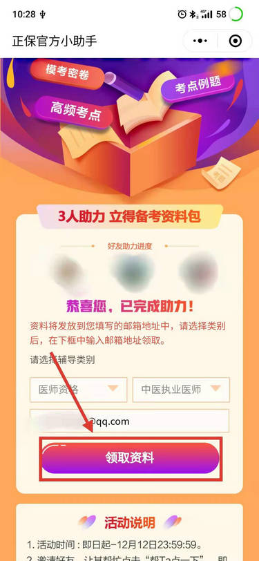 三、助力滿三人進入領(lǐng)取頁面,輸入類別/郵箱,點擊“領(lǐng)取資料”,即可領(lǐng)取“學(xué)霸禮包”。