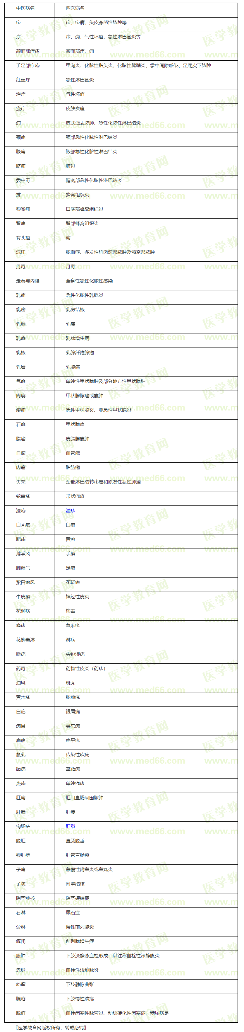 2021年中醫(yī)執(zhí)業(yè)醫(yī)師《中醫(yī)外科學》所有疾病對應西醫(yī)病名一覽表