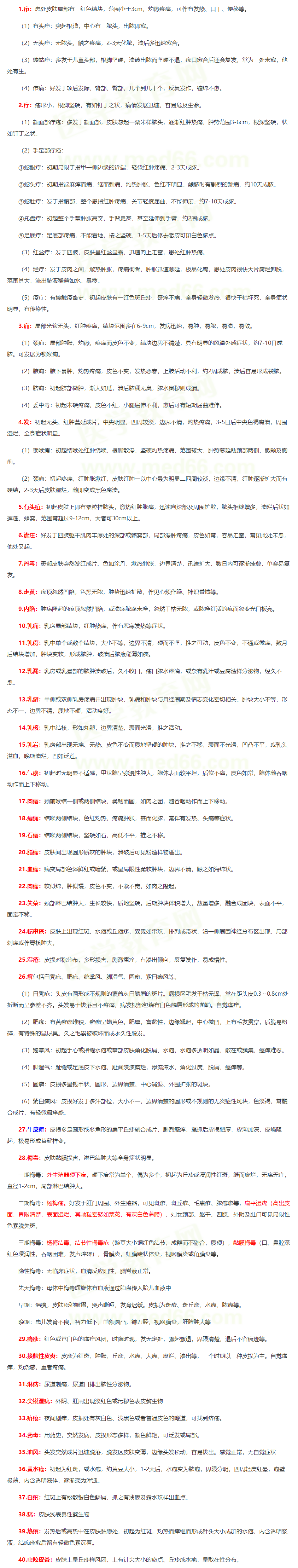 55.血栓性淺靜脈炎:淺靜脈走行處呈條索狀突起、色赤,形如蚯蚓、硬而疼痛。