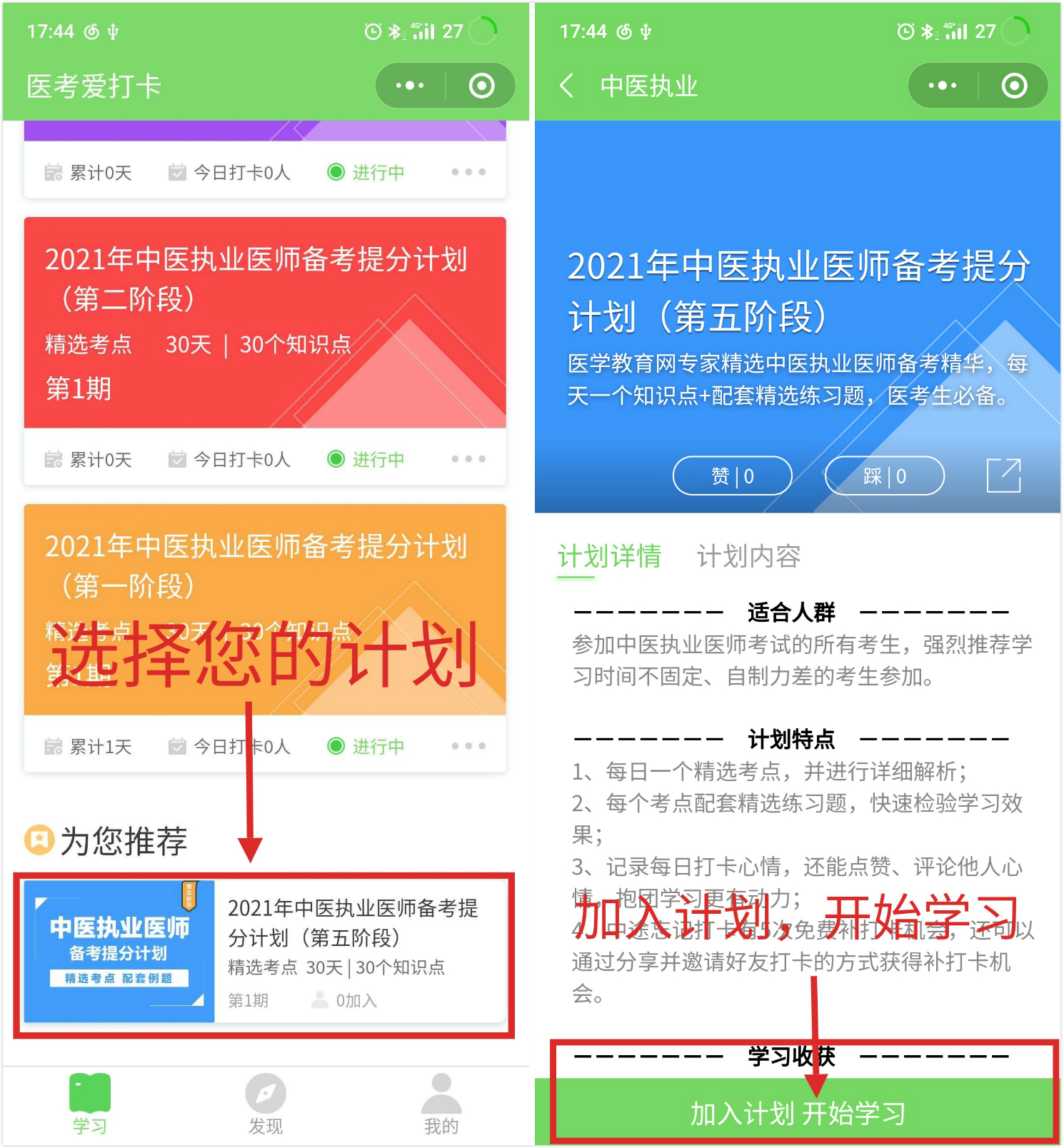 第三步:選擇備考科目后即進(jìn)入學(xué)習(xí)計(jì)劃選擇的頁面,請(qǐng)選擇“您的備考計(jì)劃”,如2021年中醫(yī)執(zhí)業(yè)醫(yī)師備考**計(jì)劃(第五階段),然后點(diǎn)擊下方“加入計(jì)劃開始學(xué)習(xí)”按鈕,開始正式進(jìn)入打卡學(xué)習(xí);