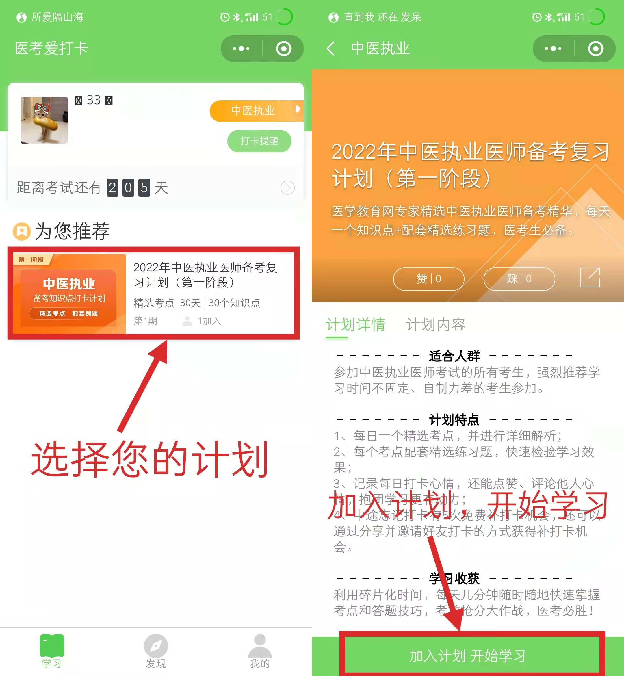 第三步:選擇備考科目后即進入學(xué)習(xí)計劃選擇的頁面,請選擇“您的備考計劃”,如中醫(yī)執(zhí)業(yè)醫(yī)師備考復(fù)習(xí)計劃(第一階段),然后點擊下方“加入計劃 開始學(xué)習(xí)”按鈕,開始正式進入打卡學(xué)習(xí)。