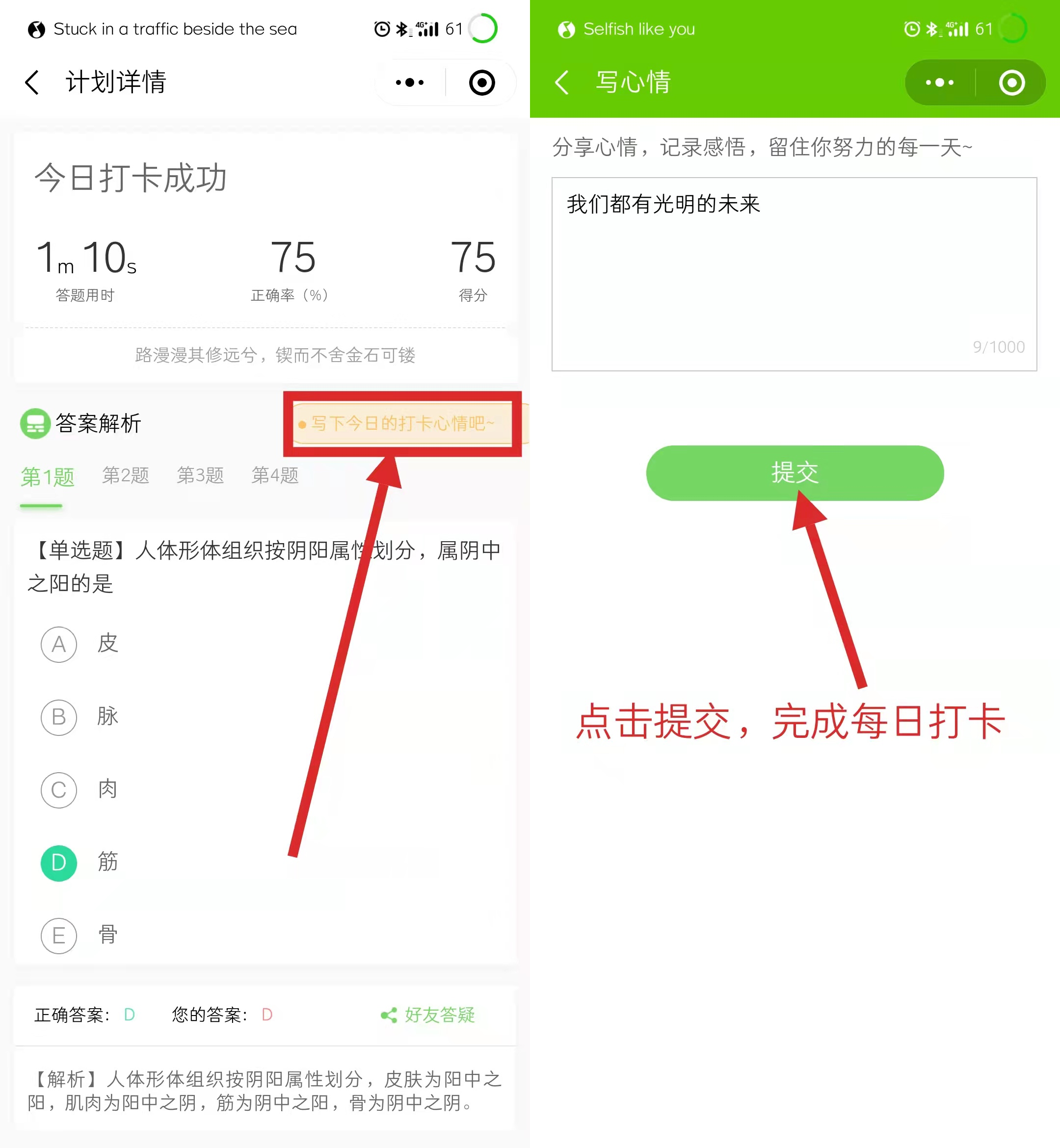 (3)查看測試結(jié)果+答案解析+分享今日打卡心情,提交完成打卡