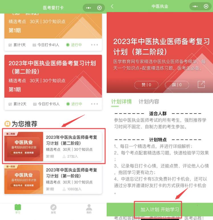 請(qǐng)選擇中醫(yī)執(zhí)業(yè)醫(yī)師備考復(fù)習(xí)計(jì)劃(第一階段),然后點(diǎn)擊下方“加入計(jì)劃開(kāi)始學(xué)習(xí)”按鈕,開(kāi)始正式進(jìn)入打卡學(xué)習(xí);