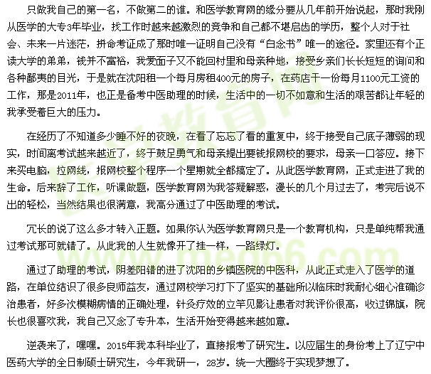 在2016年我的醫(yī)考之路大型征文活動(dòng)中,醫(yī)學(xué)教育網(wǎng)學(xué)員積極參與,為我們帶來(lái)了很多精彩的文章,網(wǎng)校中醫(yī)執(zhí)業(yè)醫(yī)師學(xué)員lyy****根據(jù)自己參加2016年中醫(yī)執(zhí)業(yè)醫(yī)師考試的經(jīng)歷寫(xiě)了這篇:《我的醫(yī)考之路——踮起腳尖,接近陽(yáng)光》,此篇文章在征文比賽中獲得了二等獎(jiǎng)的好成績(jī),讓我們一起來(lái)見(jiàn)證他的醫(yī)考之路吧!