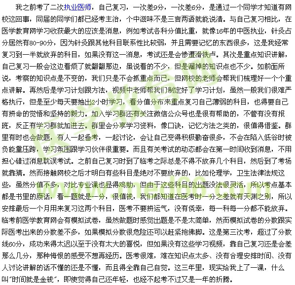 2016年我的醫(yī)考之路大型有獎征文活動火熱進行中,醫(yī)學教育網學員積極參與,為我們帶來了很多精彩的文章,網校中醫(yī)執(zhí)業(yè)醫(yī)師學員kkss***根據自己參加2016年中醫(yī)執(zhí)業(yè)醫(yī)師考試的經歷寫了這篇:《我的醫(yī)考之路》,讓我們一起來見證他的醫(yī)考之路吧!