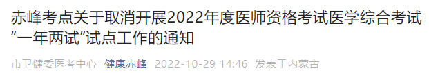 鑒于目前疫情形勢,為切實做好赤峰市新冠肺炎疫情防控工作,保障廣大考生及考務(wù)工作人員及工作人員的身體健康,取消原定于2022年11月12日-13日開展的內(nèi)蒙古自治區(qū)2022年醫(yī)師資格考試醫(yī)學(xué)綜合考試“一年兩試”(試點)工作。
