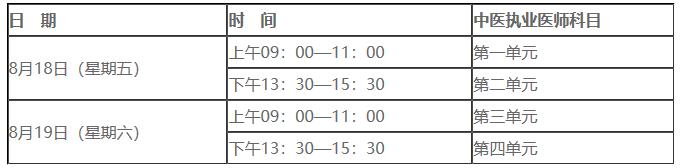 2023年中醫(yī)執(zhí)業(yè)醫(yī)師醫(yī)學(xué)綜合考試一試全國(guó)統(tǒng)一考試時(shí)間為8月18日和19日。各科目具體考試時(shí)間安排,詳情如下:
