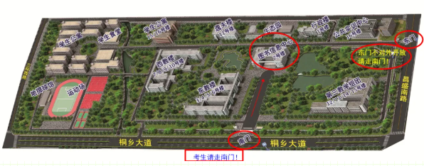 本次考試學校僅開放南大門(嘉興市桐鄉(xiāng)大道547號)供考生出入??忌囕v不得進入校園,周邊最近停車點為嘉興體育館(扒泥浜店)停車場(停車位有限),請考生充分考慮從停車場到學校,以及進校驗檢和排隊等候時間,預(yù)留好足夠時間,確??记?小時到達考場、考前30分鐘到達考試教室門口。