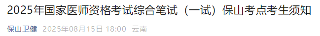 2025年國家醫(yī)師資格考試綜合筆試(一試)將于8月22日- 24日統(tǒng)一舉行,為保障考生順利參加考試,現(xiàn)將保山考點具體安排告知如下,請全體考生遵照執(zhí)行。