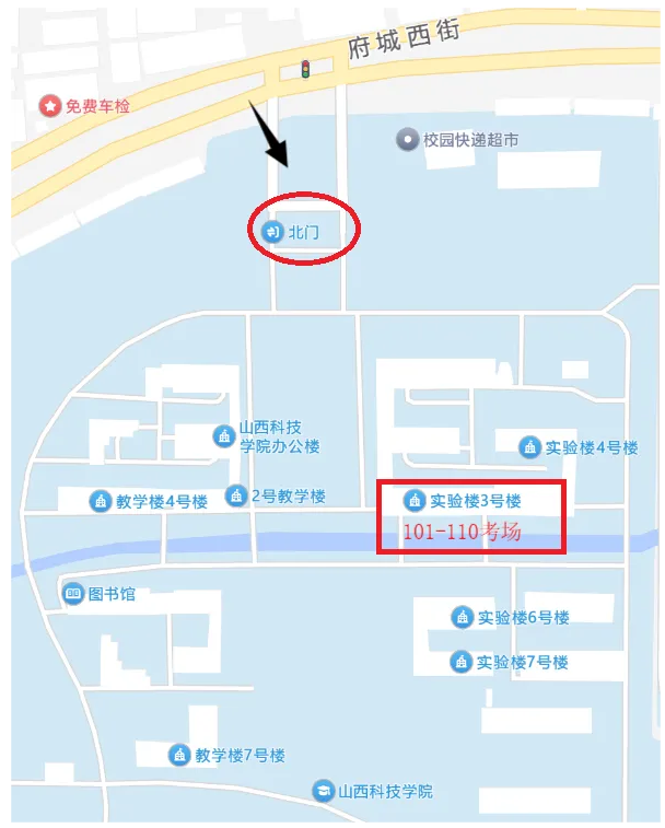 今年我市共設(shè)置山西科技學(xué)院晉城職業(yè)技術(shù)學(xué)院兩個(gè)考點(diǎn),其中101-110考場在山西科技學(xué)院三號(hào)樓5層、6層,考生需從位于府城西街的山西科技學(xué)院北門進(jìn)入。如下圖所示: