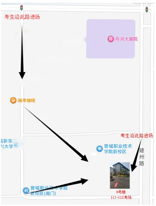 111-112考場在晉城職業(yè)技術(shù)學(xué)院9號(hào)樓4層晉城市丹河新城青山街686號(hào),如下圖所示:
