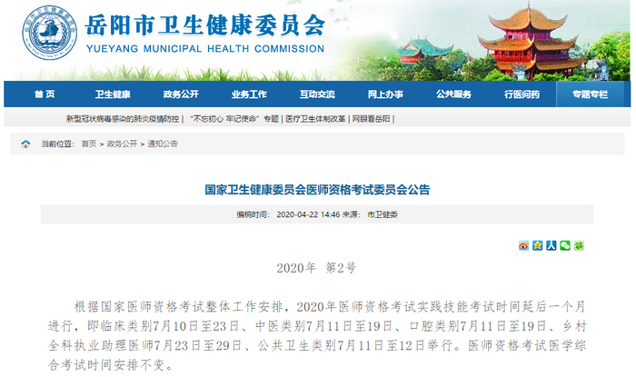 岳陽市衛(wèi)健委轉(zhuǎn)發(fā)國家中醫(yī)執(zhí)業(yè)醫(yī)師考試延期的通知