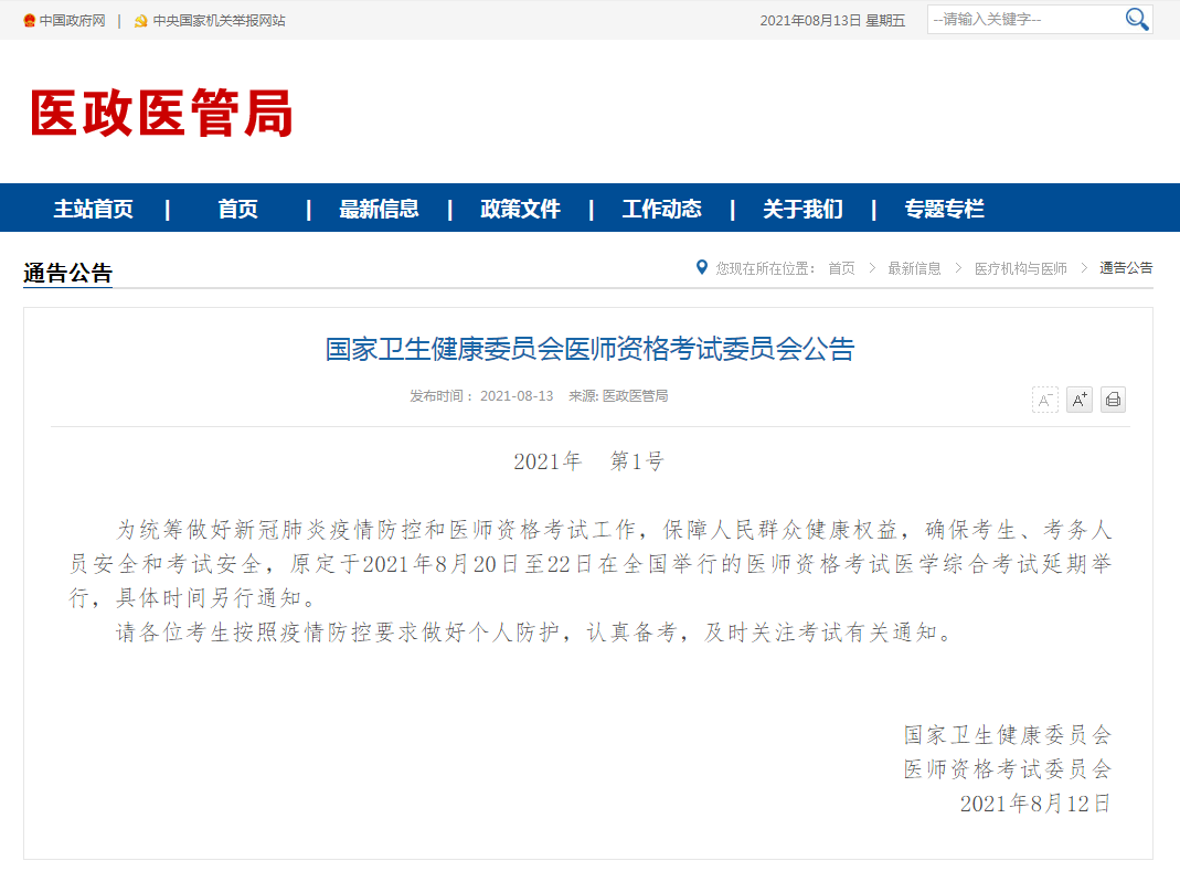 根據(jù)《國(guó)家衛(wèi)生健康委員會(huì)醫(yī)師資格考試委員會(huì)公告》(2021年第2號(hào)),確定2021年全國(guó)醫(yī)師資格考試醫(yī)學(xué)綜合考試時(shí)間延期至9月18日至20日舉行。具體內(nèi)容詳見鏈接:http://www.nhc.gov.cn/yzygj/s7655/202108/81af65e9a2b246e38d652d736507bdb3.shtml