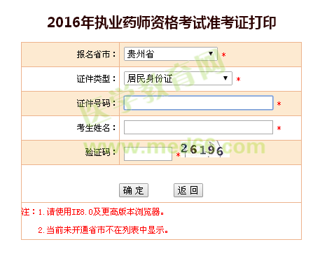 貴州2016年執(zhí)業(yè)藥師考試準(zhǔn)考證打印入口: