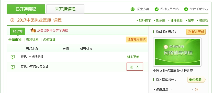 在線專業(yè)師資直播課堂使用流程 1、實驗班、定制班點擊右側專業(yè)師資直播進入使用自己的學員代碼和密碼登陸、登陸成功之后進入如下界面,點擊對應的在線專業(yè)師資直播課堂入口進入。 2、專業(yè)師資直播班學員點擊課程列表中的直播入口進行查看。 3、移動端直播課堂看課說明,點擊“發(fā)現(xiàn)”,選擇“直播課”即可進入查看課程:醫(yī)學移動課堂直播課看課流程說明>> 溫馨提示:醫(yī)學教育網專業(yè)師資直播課操作方法指導