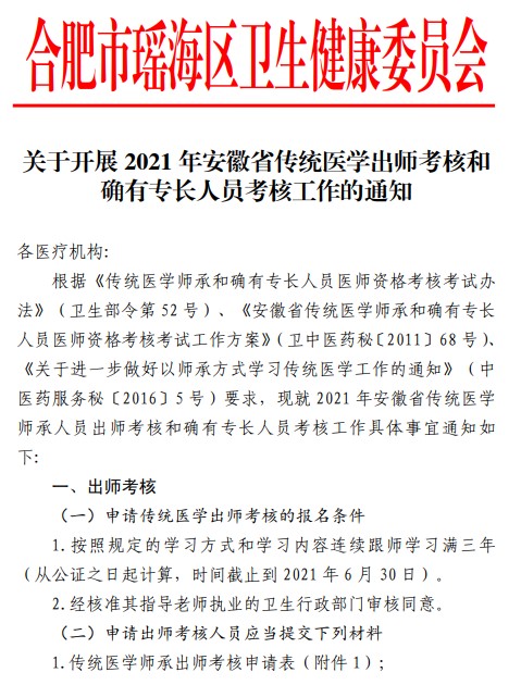 關(guān)于2021年安徽省傳統(tǒng)醫(yī)學(xué)出師考核和確有專長人員考核工作的通知