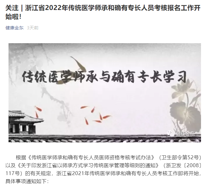 浙江省金華市金東區(qū)2022年傳統(tǒng)醫(yī)學師承和確有專長人員考核報名工作開始