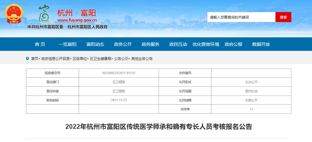 浙江省中醫(yī)藥管理局關于做好2022年傳統(tǒng)醫(yī)學師承和確有專長人員考核報名工作的通知(http://www.fuyang.gov.cn/art/2021/11/23/art_1228923521_59223969.html)