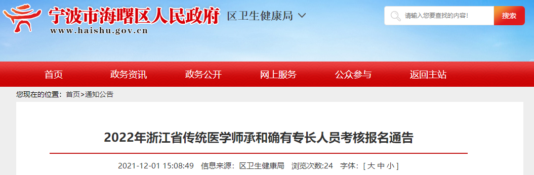 附件:浙江省中醫(yī)藥管理局關(guān)于做好2022年傳統(tǒng)醫(yī)學(xué)師承和確有專長(zhǎng)人員考核報(bào)名工作的通知(http://www.haishu.gov.cn/art/2021/12/1/art_1229100118_58954179.html)